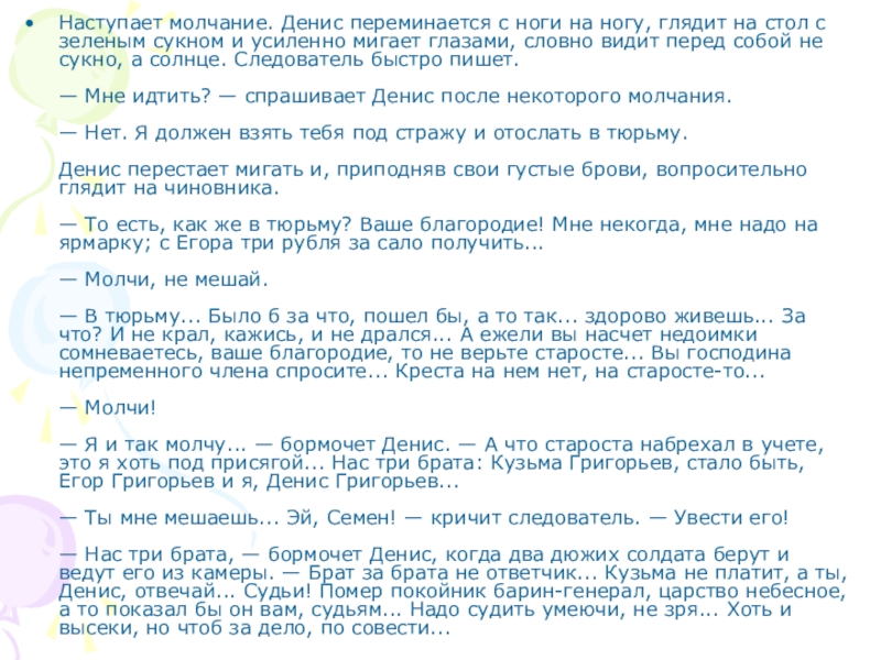 Слайд 10Наступает молчание. Денис переминается с ноги на ногу, глядит на стол