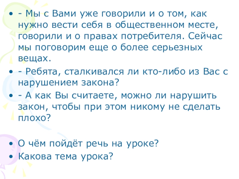 вести себя в общественном месте, говорили и о правах потребителя. Сейчас мы поговорим еще о более серьезных вещах.