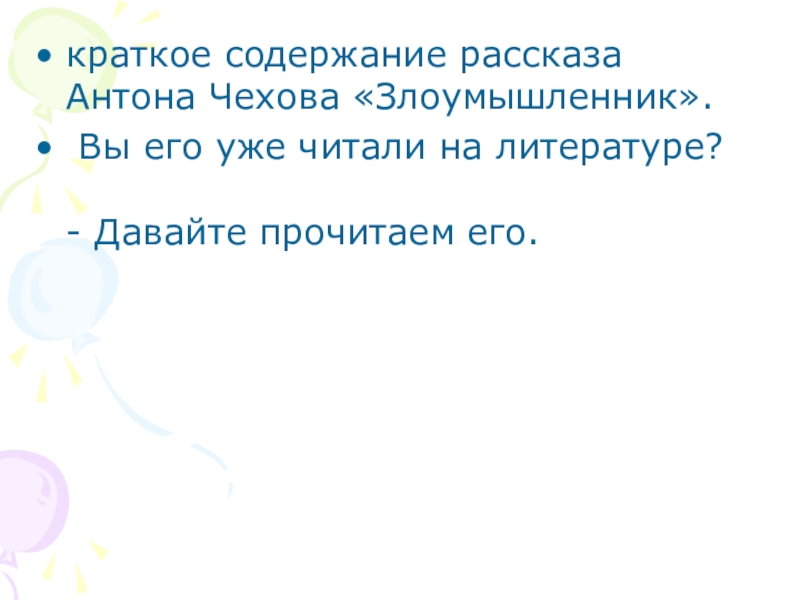 Слайд 4краткое содержание рассказа Антона Чехова «Злоумышленник».