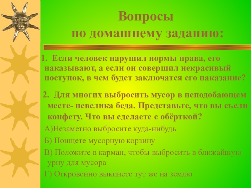 1. Если человек нарушил нормы права, его наказывают, а если он совершил некрасивый поступок, в чем будет заключатся его наказание?