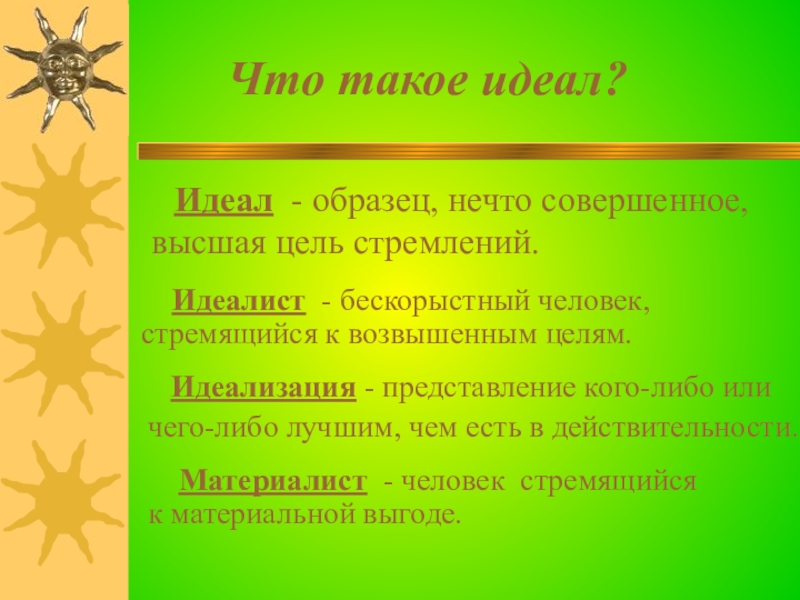 Идеалист - бескорыстный человек, стремящийся к возвышенным целям.