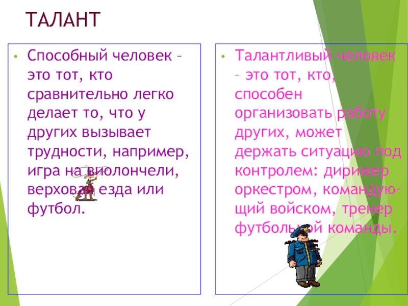 Талантливый человек – это тот, кто, способен организовать работу других, может держать ситуацию под контролем: дирижер оркестром, командую-щий войском, тренер футбольной команды.