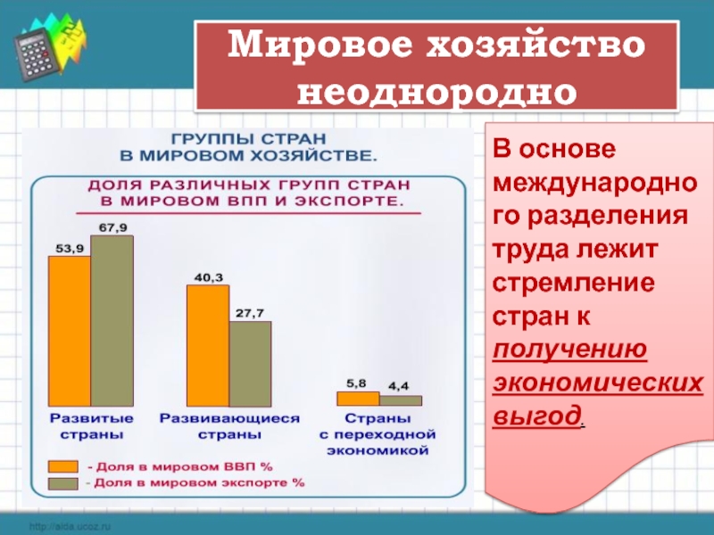 В МИРОВОМ ХОЗЯЙСТВЕ СЛОЖИЛАСЬ СПЕЦИАЛИЗАЦИЯ ( МЕЖДУНАРОДНОЕ РАЗДЕЛЕНИЕ ТРУДА) СТРАН НА ПРОИЗВОДСТВЕ ТОЙ ИЛИ ИНОЙ ПРОДУКЦИИ.