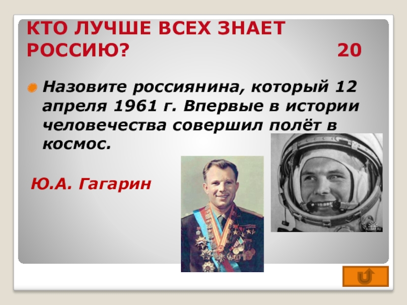Назовите россиянина, который 12 апреля 1961 г. Впервые в истории человечества совершил полёт в космос.