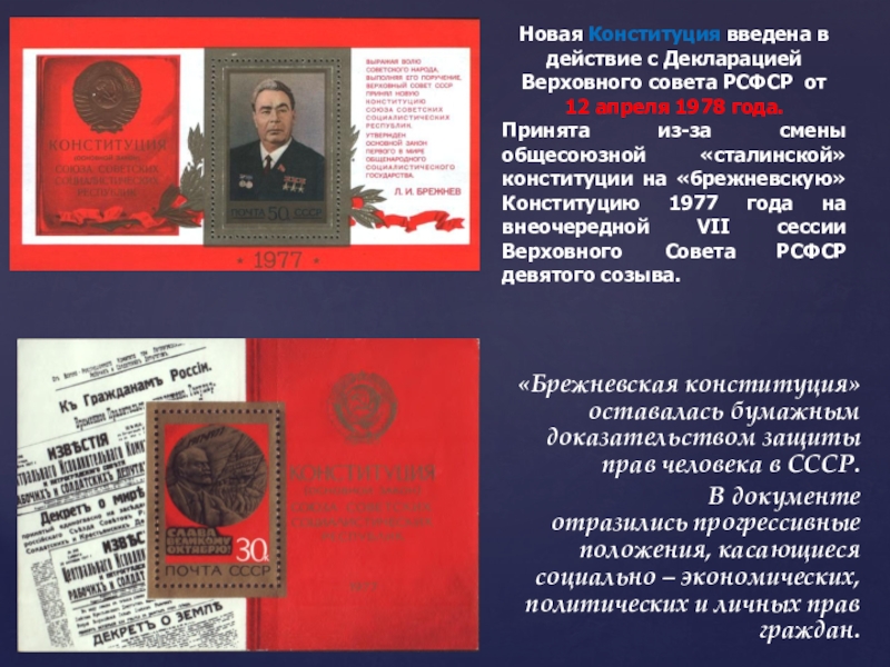 Принята из-за смены общесоюзной «сталинской» конституции на «брежневскую» Конституцию 1977 года на внеочередной VII сессии Верховного Совета РСФСР девятого созыва.