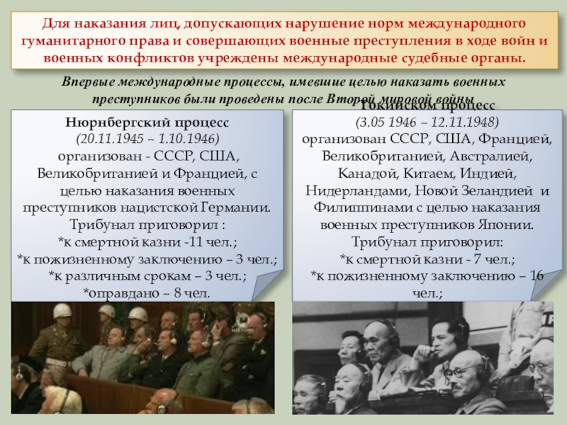 Впервые международные процессы, имевшие целью наказать военных преступников были проведены после Второй мировой войны