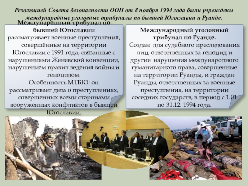 рассматривает военные преступления, совершённые на территории Югославии с 1991 года, связанные с нарушениями Женевской конвенции, нарушением правил ведения войны и геноцидом.