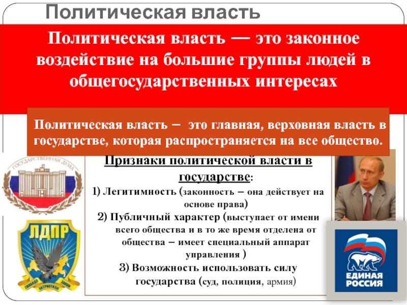 Политическая власть – это главная, верховная власть в государстве, которая распространяется на все общество.