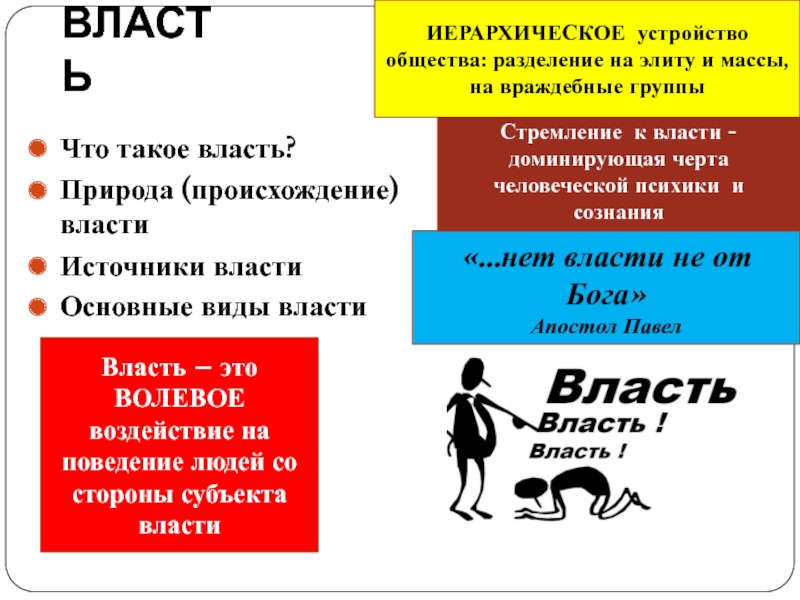 ВЛАСТЬЧто такое власть?Природа (происхождение) властиИсточники властиОсновные виды властиВласть – это ВОЛЕВОЕ воздействие на поведение людей со стороны