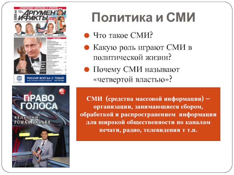Политика и СМИЧто такое СМИ?Какую роль играют СМИ в политической жизни?Почему СМИ называют «четвертой властью»?СМИ (средства массовой