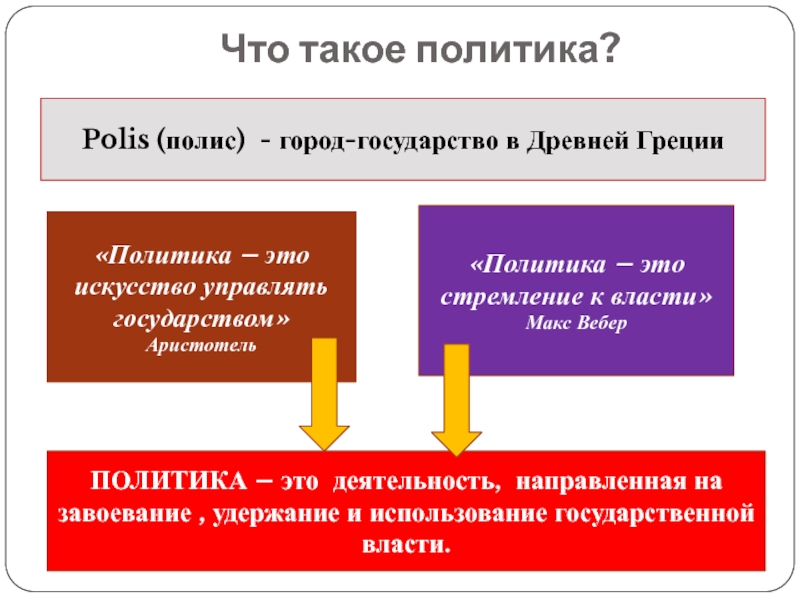 Что такое политика? Polis (полис) - город-государство в Древней Греции«Политика – это искусство управлять государством»Аристотель«Политика – это