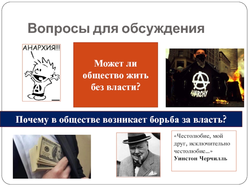 Вопросы для обсуждения Может ли общество жить без власти?Почему в обществе возникает борьба за власть? «Честолюбие, мой