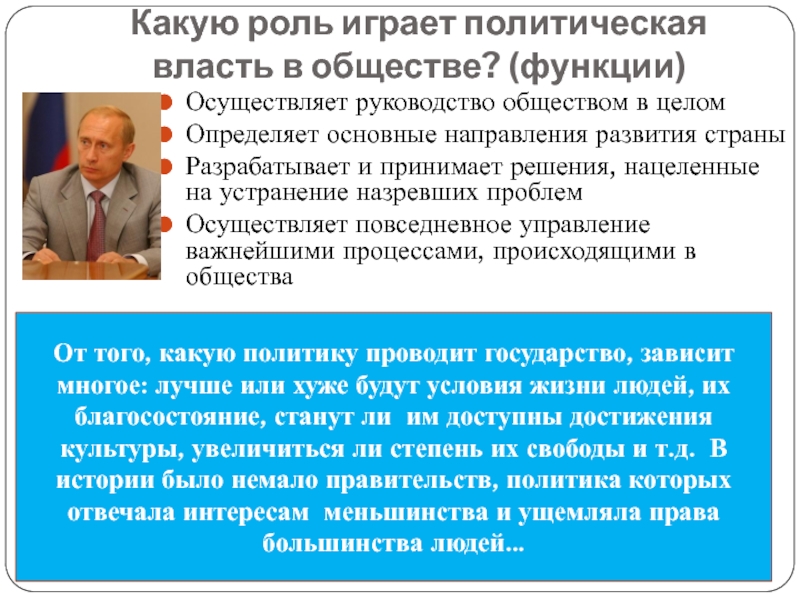 Какую роль играет политическая власть в обществе? (функции) Осуществляет руководство обществом в целомОпределяет основные направления развития страныРазрабатывает