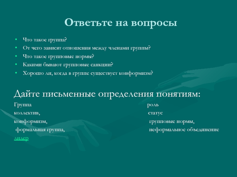 1. Группы 2. Признакам 3. Двух человек 4.Семь плюс-минус два 5. Цели 6.Деятельности 7. Временные 8. Постоянные 9. Официальные (формальные ) 10. Неофициальные (неформальные) 11. Статус 12. Роль