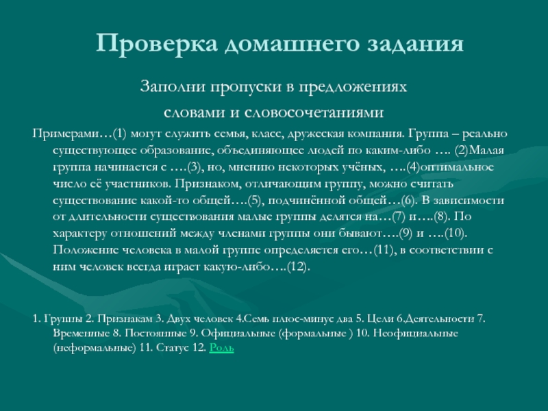 семья, класс, дружеская компания. Группа – реально существующее образование, объединяющее людей по каким-либо …. (2)Малая группа начинается с ….(3), но, мнению некоторых учёных, ….(4)оптимальное число её участников. Признаком, отличающим группу, можно считать существование какой-то общей….(5), подчинённой общей…(6). В зависимости от длительности существования малые группы делятся на…(7) и….(8). По характеру отношений между членами группы они бывают….(9) и ….(10). Положение человека в малой группе определяется его…(11), в соответствии с ним человек всегда играет какую-либо….(12).