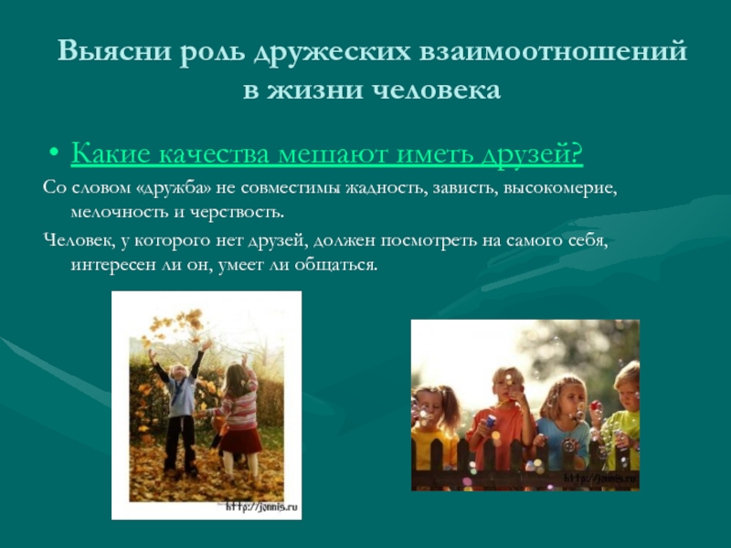 Слайд 10Выясни роль дружеских взаимоотношений в жизни человека