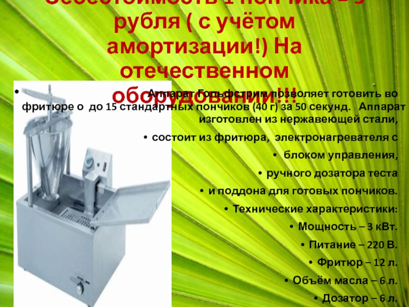Аппарат Гольфстрим позволяет готовить во фритюре о до 15 стандартных пончиков (40 г) за 50 секунд. Аппарат изготовлен из нержавеющей стали,