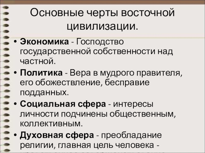 Духовная сфера - преобладание религии, главная цель человека - нравственное совершенствование.
