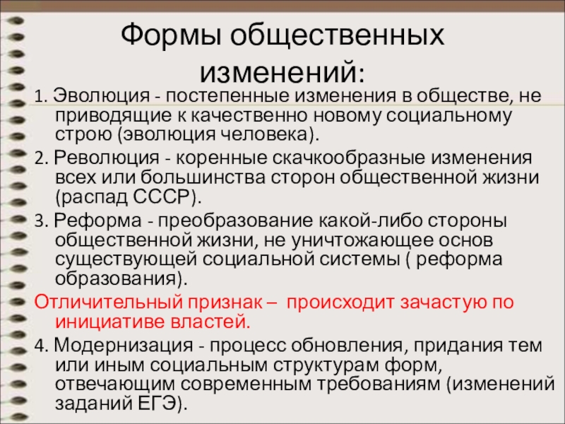 1. Эволюция - постепенные изменения в обществе, не приводящие