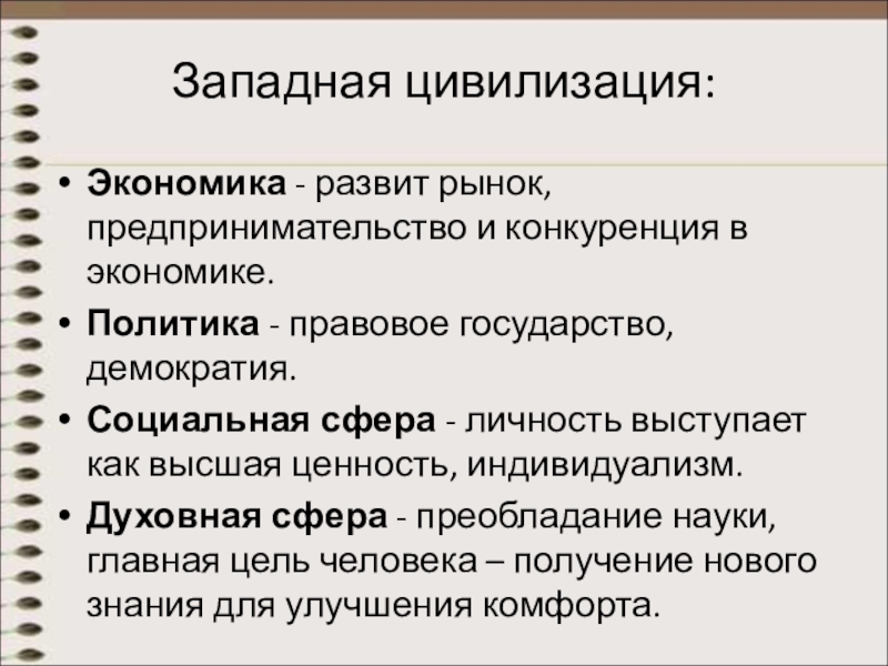 Духовная сфера - приоритет отдается науке и образованию, высшей ценностью выступает честь и достоинство личности.