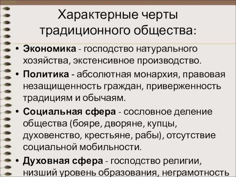 абсолютная монархия, правовая незащищенность граждан, приверженность традициям и обычаям.