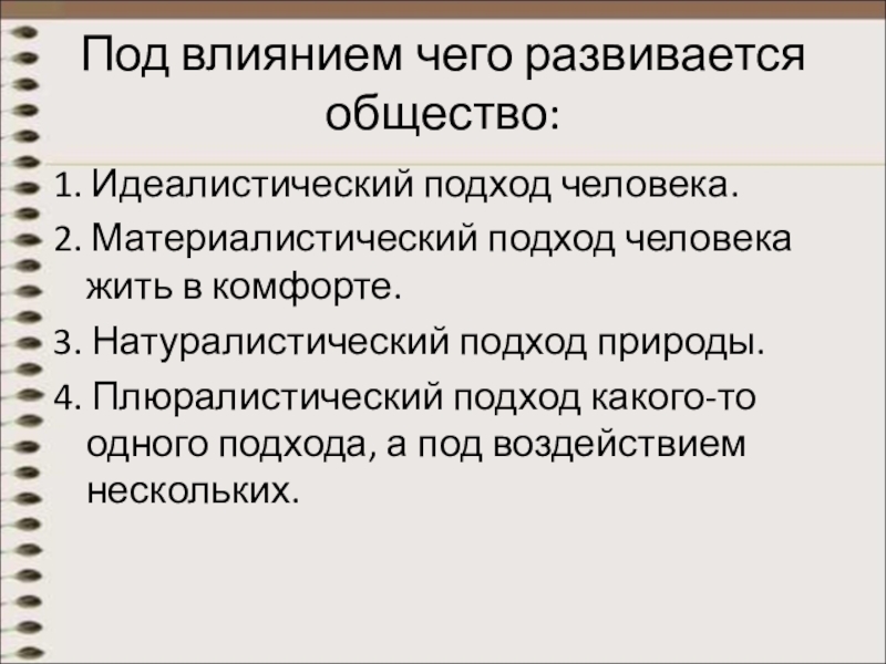 4. Плюралистический подход какого-то одного подхода, а под воздействием нескольких.