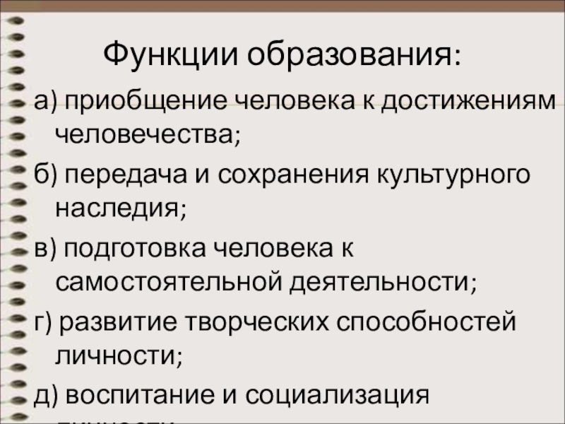 → социализирующая - приобщение человека к достижениям цивилизации.