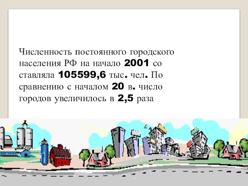 Слайд 32Численность постоянного городского населения РФ на начало 2001 составляла 105599,6 тыс.