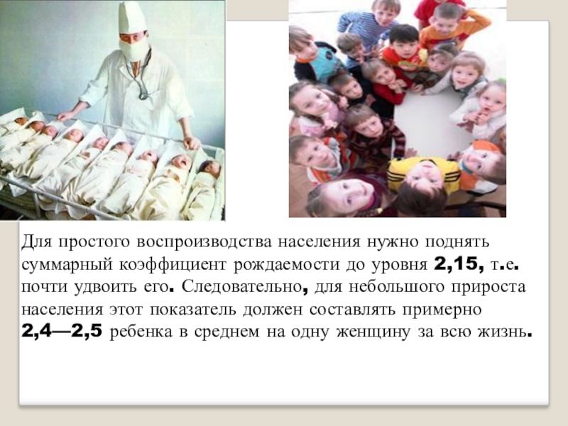 Слайд 36Для простого воспроизводства населения нужно поднять суммарный коэффициент рождаемости до уровня