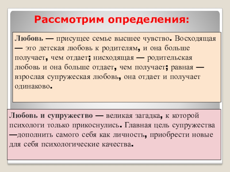 любовь к родителям, и она больше получает, чем отдает; нисходящая — родительская любовь и она больше отдает, чем получает; равная — взрослая супружеская любовь, она отдает и получает одинаково.