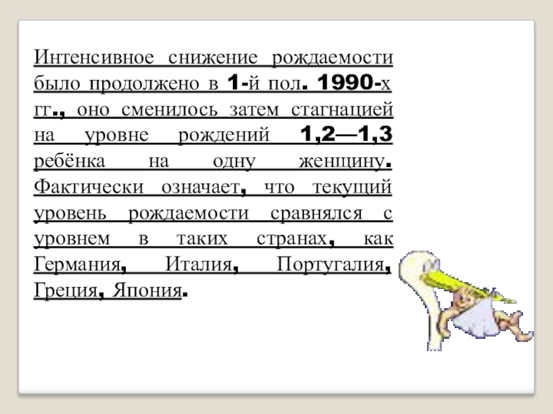 Слайд 35Интенсивное снижение рождаемости было продолжено в 1-й пол. 1990-х гг., оно