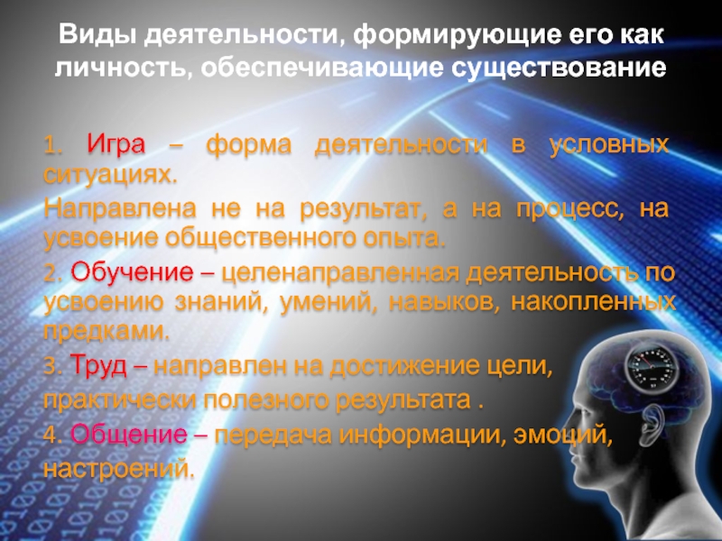 Слайд 30Виды деятельности, формирующие его как личность, обеспечивающие существование