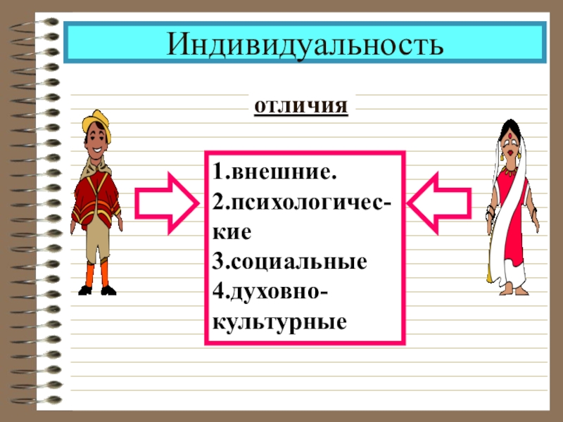 Индивидуальностьотличия1.внешние.2.психологичес-кие3.социальные4.духовно-культурные