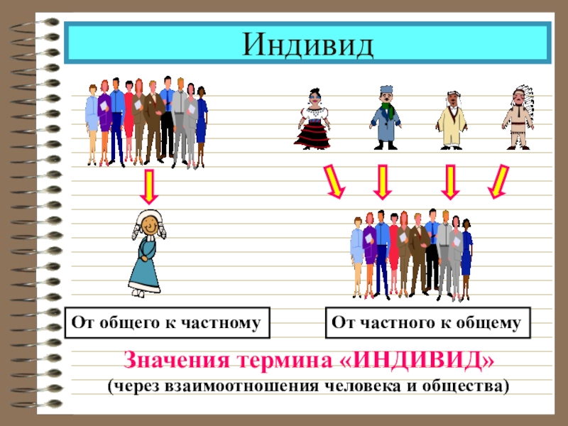 ИндивидЗначения термина «ИНДИВИД»(через взаимоотношения человека и общества)От общего к частномуОт частного к общему