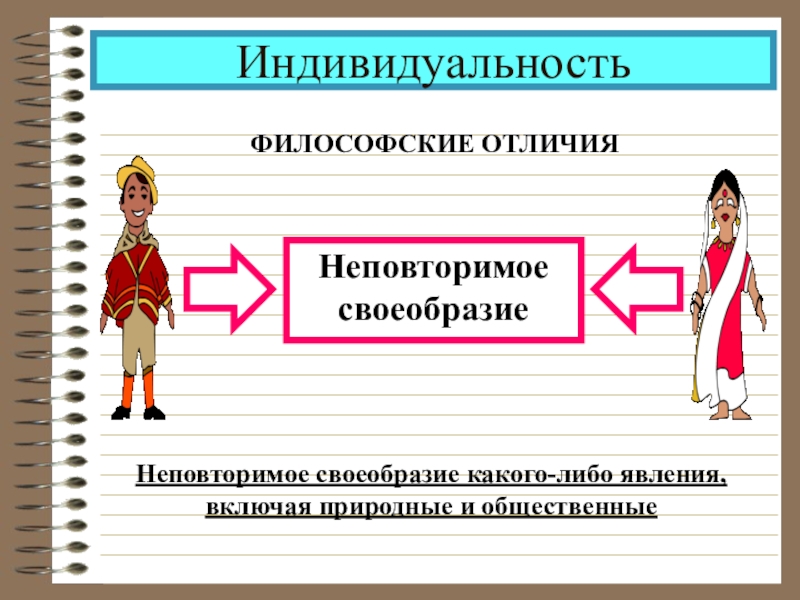 ИндивидуальностьФИЛОСОФСКИЕ ОТЛИЧИЯНеповторимое своеобразиеНеповторимое своеобразие какого-либо явления, включая природные и общественные