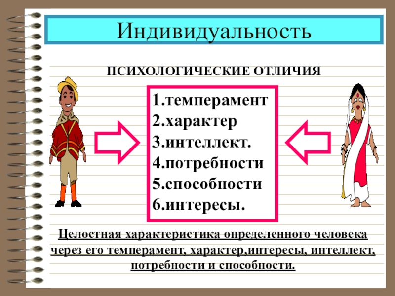 ИндивидуальностьПСИХОЛОГИЧЕСКИЕ ОТЛИЧИЯ1.темперамент2.характер3.интеллект.4.потребности 5.способности6.интересы.Целостная характеристика определенного человека через его темперамент, характер,интересы, интеллект, потребности и способности.