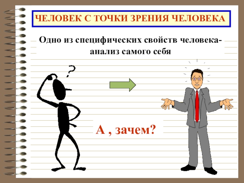 ЧЕЛОВЕК С ТОЧКИ ЗРЕНИЯ ЧЕЛОВЕКАОдно из специфических свойств человека-анализ самого себяА , зачем?