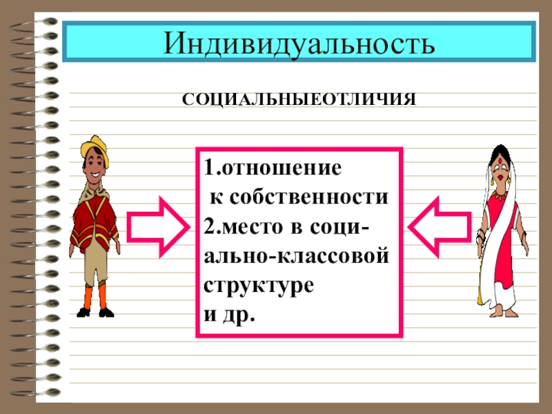 ИндивидуальностьСОЦИАЛЬНЫЕОТЛИЧИЯ1.отношение к собственности2.место в соци-ально-классовойструктуреи др.