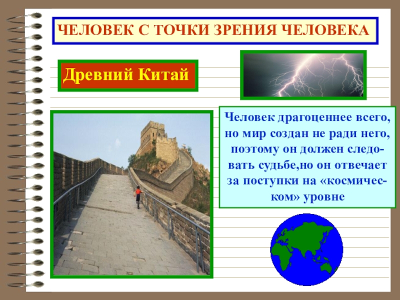 ЧЕЛОВЕК С ТОЧКИ ЗРЕНИЯ ЧЕЛОВЕКАДревний КитайЧеловек драгоценнее всего,но мир создан не ради него,поэтому он должен следо-вать судьбе,но