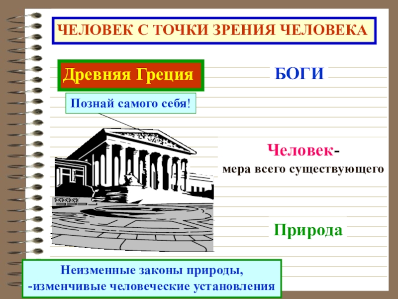 ЧЕЛОВЕК С ТОЧКИ ЗРЕНИЯ ЧЕЛОВЕКАДревняя ГрецияПознай самого себя!БОГИЧеловек-мера всего существующегоПриродаНеизменные законы природы,-изменчивые человеческие установления