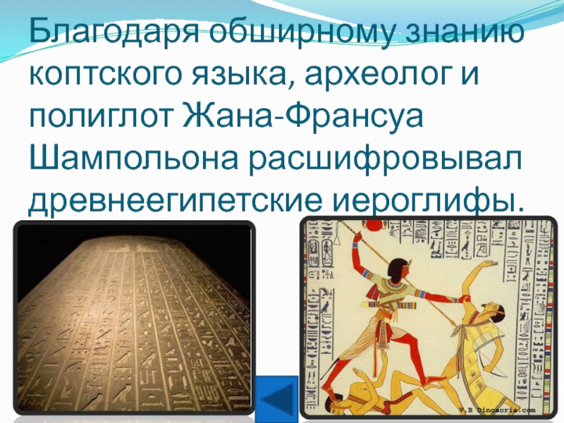 Благодаря обширному знанию коптского языка, археолог и полиглот Жана-Франсуа Шампольона расшифровывал