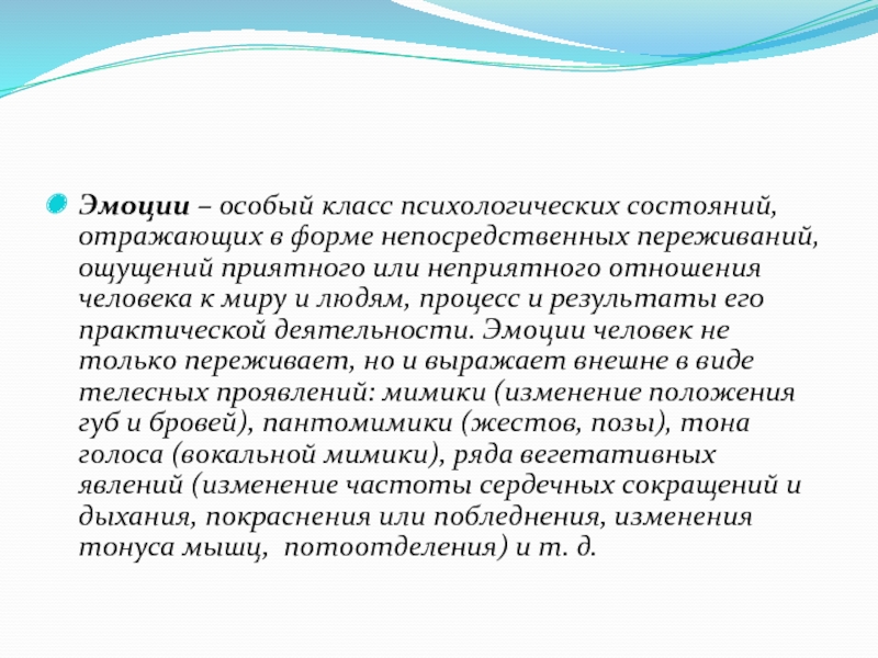 ощущений приятного или неприятного отношения человека к миру и людям, процесс и результаты его практической деятельности. Эмоции человек не только переживает, но и выражает внешне в виде телесных проявлений: мимики (изменение положения губ и бровей), пантомимики (жестов, позы), тона голоса (вокальной мимики), ряда вегетативных явлений (изменение частоты сердечных сокращений и дыхания, покраснения или побледнения, изменения тонуса мышц, потоотделения) и т. д.