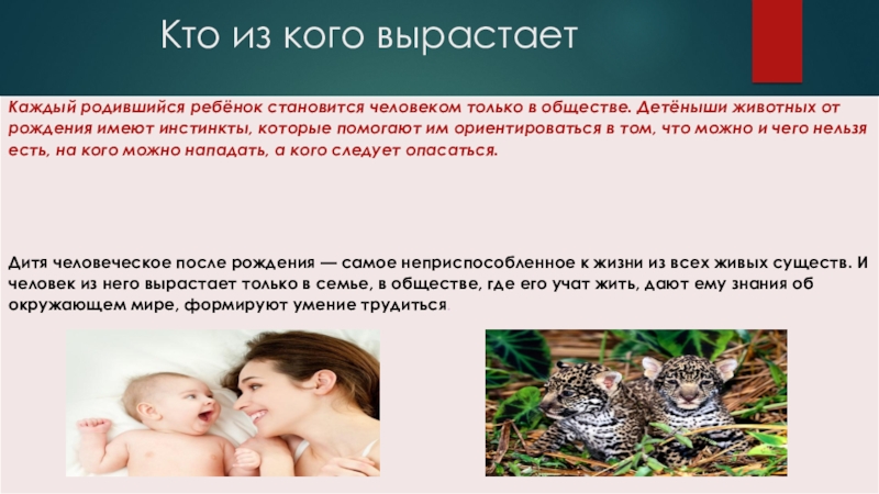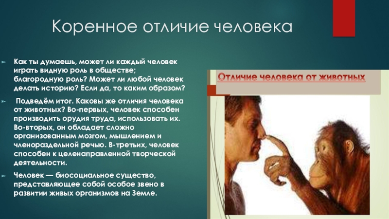 Подведём итог. Каковы же отличия человека от животных? Во-первых, человек способен производить орудия труда, использовать их. Во-вторых, он обладает сложно организованным мозгом, мышлением и членораздельной речью. В-третьих, человек способен к целенаправленной творческой деятельности.