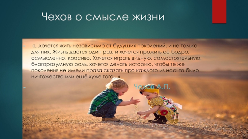 независимо от будущих поколений, и не только для них. Жизнь даётся один раз, и хочется прожить её бодро, осмысленно, красиво. Хочется играть видную, самостоятельную, благоразумную роль, хочется делать историю, чтобы те же поколения не имели права сказать про каждого из нас: то было ничтожество или ещё хуже того...»