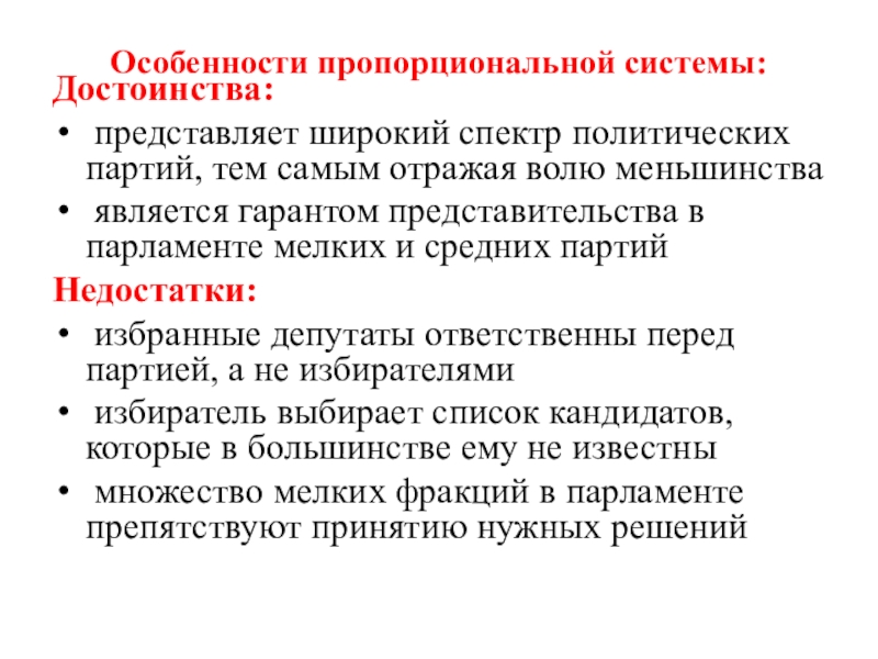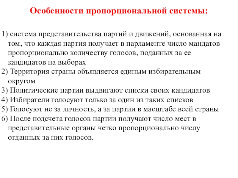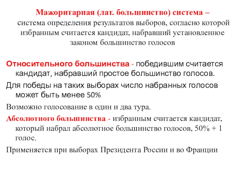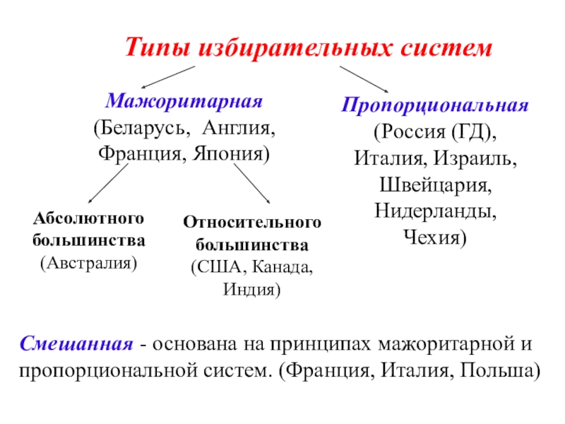 Смешанная - основана на принципах мажоритарной и пропорциональной систем. (Франция, Италия, Польша)