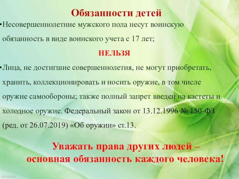 Лица, не достигшие совершеннолетия, не могут приобретать, хранить, коллекционировать и носить оружие, в том числе оружие самообороны; также полный запрет введен на кастеты и холодное оружие. Федеральный закон от 13.12.1996 № 150-ФЗ (ред. от 26.07.2019) «Об оружии» ст.13.