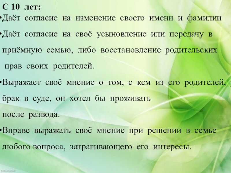 Вправе выражать своё мнение при решении в семье любого вопроса, затрагивающего его интересы.