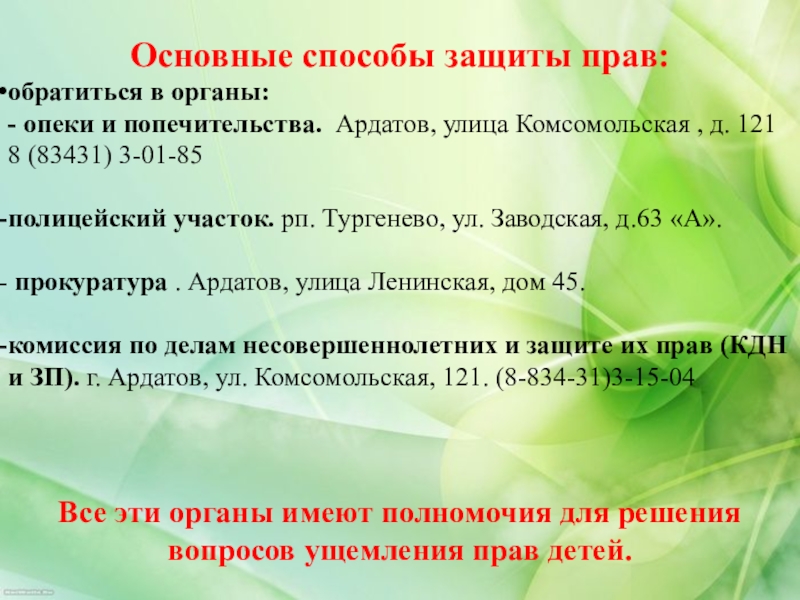 Все эти органы имеют полномочия для решения вопросов ущемления прав детей.