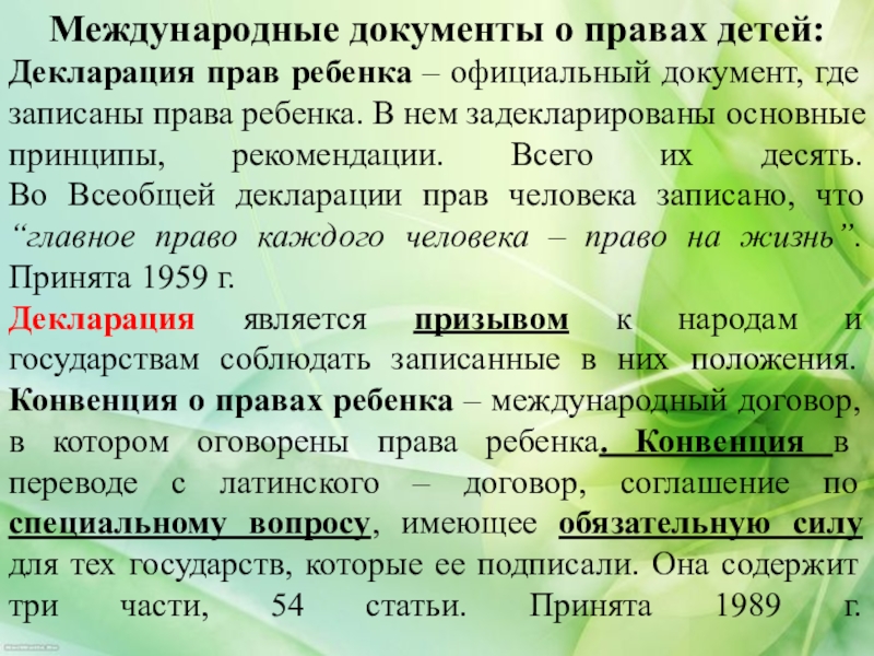 Конвенция о правах ребенка – международный договор, в котором оговорены права ребенка. Конвенция в переводе с латинского – договор, соглашение по специальному вопросу, имеющее обязательную силу для тех государств, которые ее подписали. Она содержит три части, 54 статьи. Принята 1989 г.