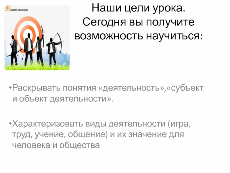 Наши цели урока. Сегодня вы получите возможность научиться:Раскрывать понятия «деятельность»,«субъект и объект деятельности».Характеризовать виды деятельности (игра, труд,